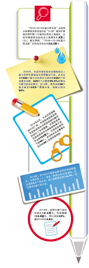 生態(tài)環(huán)境部公開的數(shù)據(jù)便是有力的證明——2018年 , 全國338個(gè)地級(jí)及以上城市優(yōu)良天數(shù)比例同比提高1.3個(gè)百分點(diǎn) , 細(xì)顆粒物(PM2.5)濃度同比下降9.3%;其中 , 北京市PM2.5濃度同比下降12.1%。2018年 , 在1940個(gè)國家地表水評(píng)價(jià)考核斷面中 , 水質(zhì)優(yōu)良(Ⅰ~Ⅲ類)斷面比例為71.0% , 同比提高3.1個(gè)百分點(diǎn);劣Ⅴ類斷面比例為6.7% , 同比降低1.6個(gè)百分點(diǎn)。