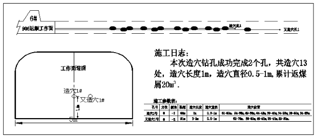 造穴鉆孔于3月31日四點(diǎn)班開(kāi)始施工至4月1日四點(diǎn)班結(jié)束,施工期間大隆礦技術(shù)人員到現(xiàn)場(chǎng)指導(dǎo),共成功施工造穴鉆孔2個(gè)。