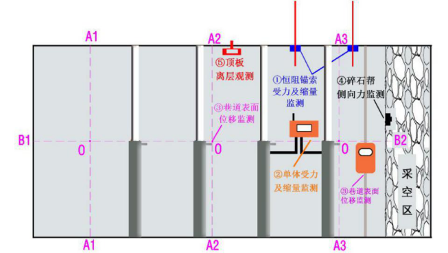 為了及時掌握留巷圍巖變形信息,檢驗支護結(jié)構(gòu)可靠性、設(shè)計參數(shù)及施工工藝的合理性,對支護狀況進行預(yù)測和跟蹤反饋,為參數(shù)設(shè)計及優(yōu)化提供科學(xué)的依據(jù),必須進行留巷區(qū)域礦壓監(jiān)測。監(jiān)測內(nèi)容主要包括巷道全斷面非對稱變形表面位移監(jiān)測、頂板離層監(jiān)測、恒阻大變形錨索受力及恒阻體滑移量監(jiān)測。在留巷前100m內(nèi),每20m布置一個監(jiān)測站,共包括6個測站,監(jiān)測站內(nèi)的監(jiān)測內(nèi)容如圖2所示。