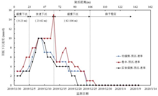 (1)第一階段,架后 0-23 m,頂板緩慢下沉,下沉速率 3-5 mm/d。