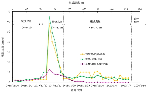 (3)第三階段,架后 80-150 m,緩慢底臌,底臌速率 3-10 mm/d。