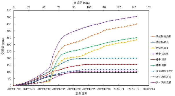 圖3為測站#1在不同的架后距離時,巷道不同變形內(nèi)容監(jiān)測曲線,包括實體煤側(cè)、巷道中、切縫側(cè)隨時間發(fā)展的頂?shù)装逡平俊㈨敯逑鲁亮?、底臌量?/p>