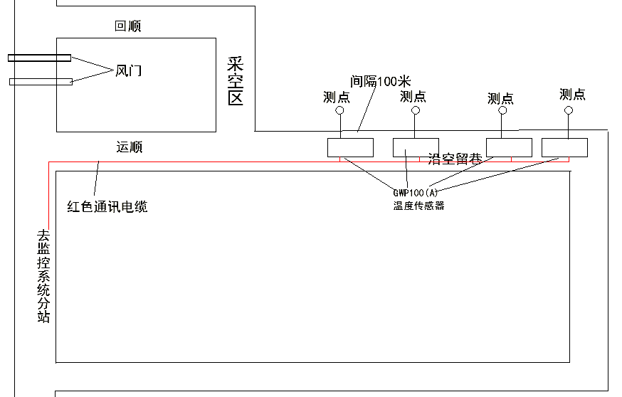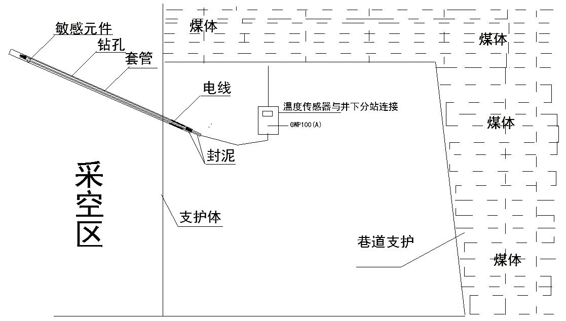 4.1.2利用溫度傳感器,對(duì)沿空留巷沿途每間隔100m進(jìn)行重點(diǎn)區(qū)域進(jìn)行檢測(cè),確保數(shù)據(jù)準(zhǔn)確及可靠。采空區(qū)檢測(cè)點(diǎn)距支護(hù)巷道表面1.5-3.0m的區(qū)間。為監(jiān)測(cè)5-7m區(qū)間采空區(qū)溫度的變化(如有需要可加長(zhǎng)檢測(cè)元件電纜的長(zhǎng)度),將GWP100(A)型溫度傳感器的檢測(cè)元件加長(zhǎng)連接線(采用4×1.5mm2礦用阻燃電纜)達(dá)10m,在使用前對(duì)傳感器檢測(cè)數(shù)據(jù)失真狀況進(jìn)行調(diào)試,對(duì)自然發(fā)火重點(diǎn)部位打孔徑為Φ15mm、深度達(dá)到采空區(qū)5-7m,埋入傳感器檢測(cè)元件,將傳感器聯(lián)入礦井安全監(jiān)控系統(tǒng),從而實(shí)現(xiàn)對(duì)煤層深部自然發(fā)火溫度的自動(dòng)、連續(xù)監(jiān)測(cè),配合火情監(jiān)測(cè)系統(tǒng)測(cè)溫裝置,更好地實(shí)現(xiàn)預(yù)報(bào)自然發(fā)火的作用。