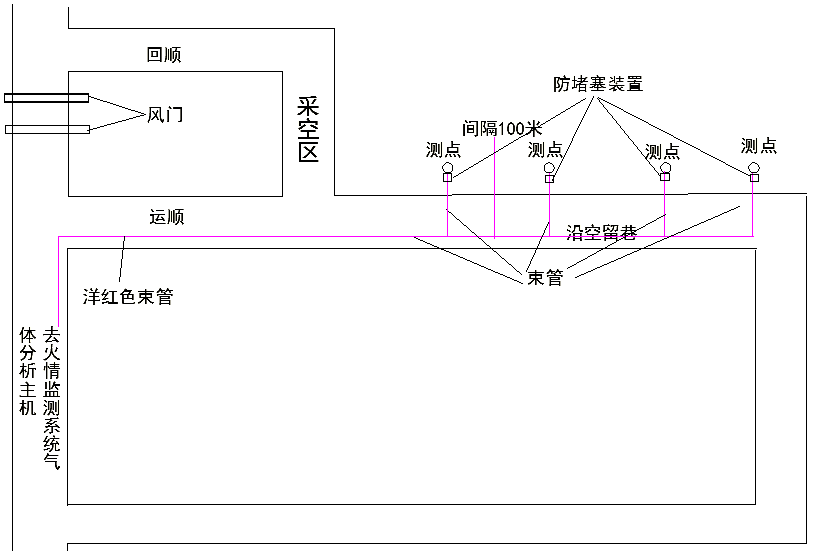 4.1.4利用火情監(jiān)測(cè)系統(tǒng)氣體分析主機(jī)對(duì)沿空留巷采空區(qū)的氣體進(jìn)行分析化驗(yàn)后將數(shù)據(jù)傳輸?shù)降孛婊鹎楸O(jiān)測(cè)系統(tǒng)中心站,并對(duì)數(shù)據(jù)進(jìn)行分析處理被告超限報(bào)警。在回風(fēng)留巷打孔,將束管穿過支護(hù),進(jìn)入采空區(qū)3到5m(如有需要可以根據(jù)實(shí)際情況加長(zhǎng)束管的伸入長(zhǎng)度),為防止束管口堵塞,管中要安設(shè)防堵塞裝置,當(dāng)CH4、CO、C2H2、O2?和CO2這幾種氣體中,CO、C2H2出現(xiàn)時(shí),說明采空區(qū)已有自燃發(fā)火現(xiàn)象。安裝方法見圖6所示。