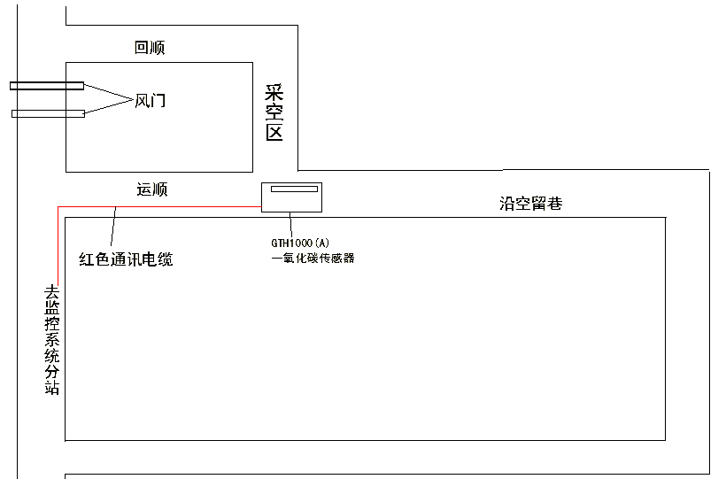 ? ? 4.1.5因?yàn)樽匀话l(fā)火是一個(gè)較慢長(zhǎng)的變化,所以在沿空留巷的末端也就是N1-1502工作面運(yùn)順端頭,安設(shè)一臺(tái)一氧化碳傳感器,來檢測(cè)通過沿空留巷風(fēng)流的一氧化碳濃度,以此來判斷沿空留采空區(qū)是否有自然現(xiàn)象及采空區(qū)是否有風(fēng)漏入沿空留巷,從而來分析采空區(qū)的自然發(fā)火情況,當(dāng)一氧化碳含量達(dá)到100ppm時(shí),說明自燃發(fā)火存在自燃發(fā)炎現(xiàn)象。一氧化碳傳感器的安設(shè)數(shù)量可以根據(jù)實(shí)際情況具體安設(shè),增加密度,CO傳感器的安設(shè)位置如圖7所示: