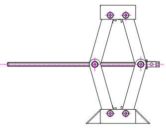 當(dāng)主運皮帶機的上托輥損壞時,檢修人員將剪式千斤頂置于上托輥架的橫梁上,利用省力扳手扳動螺桿端部的四方頭,使其圍繞螺母順時針旋轉(zhuǎn),支撐架升起,在支撐架的頂端放置一塊木鞋,當(dāng)支撐架受力后,安設(shè)在支撐架上的四對齒輪副保持支撐架穩(wěn)定不傾倒,木鞋與膠帶接觸防止損傷。當(dāng)千斤頂升起至膠帶脫離待更換托輥并保證托輥可拆卸后停止,拆除舊托輥更換新托輥,反向扳動螺桿,整個更換過程結(jié)束。剪式千斤頂升起效果圖如圖2