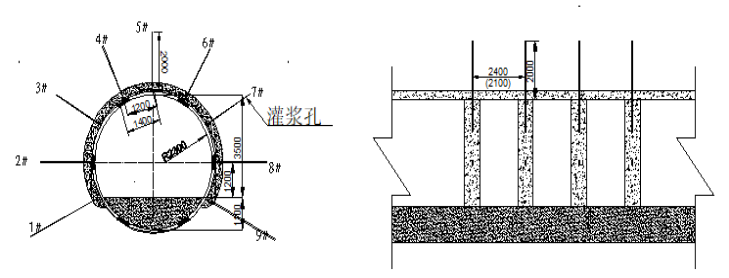 2.承壓蓋板施工工藝。劈裂注漿孔口均勻布置在巷道輪廓線上,每排布置9個劈裂注漿孔,眼孔間距1.2m,兩側(cè)最下排劈裂注漿孔角度不小于45°,深度4m;其余眼孔深度2m,巷道原支護(hù)棚距0.6m時,排距為2.4m;棚距0.7m時,排距為2.1m,見圖1。漿液采用水固比0.52:1的復(fù)合可控水泥漿液,其中劈裂注漿劑占固料的8%、Po52.5級普通硅酸鹽水泥占固料的92%。利用寸管加工成長度為1.2m注頭進(jìn)行劈裂注漿,劈裂注漿壓力≥3MPa時停止劈裂注漿。劈裂注漿采用ZBY50/7-11型電泵劈裂注漿。