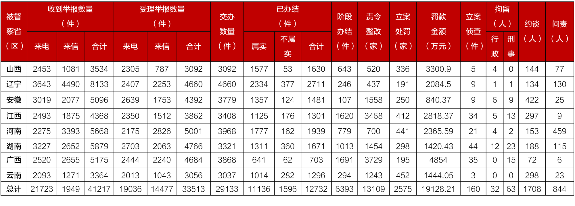 有關(guān)?。▍^(qū))高度重視督察工作,將督察作為堅決貫徹習(xí)近平生態(tài)文明思想的重要內(nèi)容,作為推動高質(zhì)量發(fā)展的重要契機(jī),黨政主要領(lǐng)導(dǎo)通過督察動員、現(xiàn)場督辦、召開專題會議,以及加強(qiáng)約談問責(zé)和立案查處等方式,大力推動督察配合和整改落實。截至5月9日,各督察組受理轉(zhuǎn)辦的29133件群眾舉報(未計重復(fù)舉報),已辦結(jié)12732件,階段辦結(jié)6393件;立案處罰2575家,罰款19128.21萬元;立案偵查160件,拘留95人;約談黨政領(lǐng)導(dǎo)干部1708人,問責(zé)844人(詳見附表)。