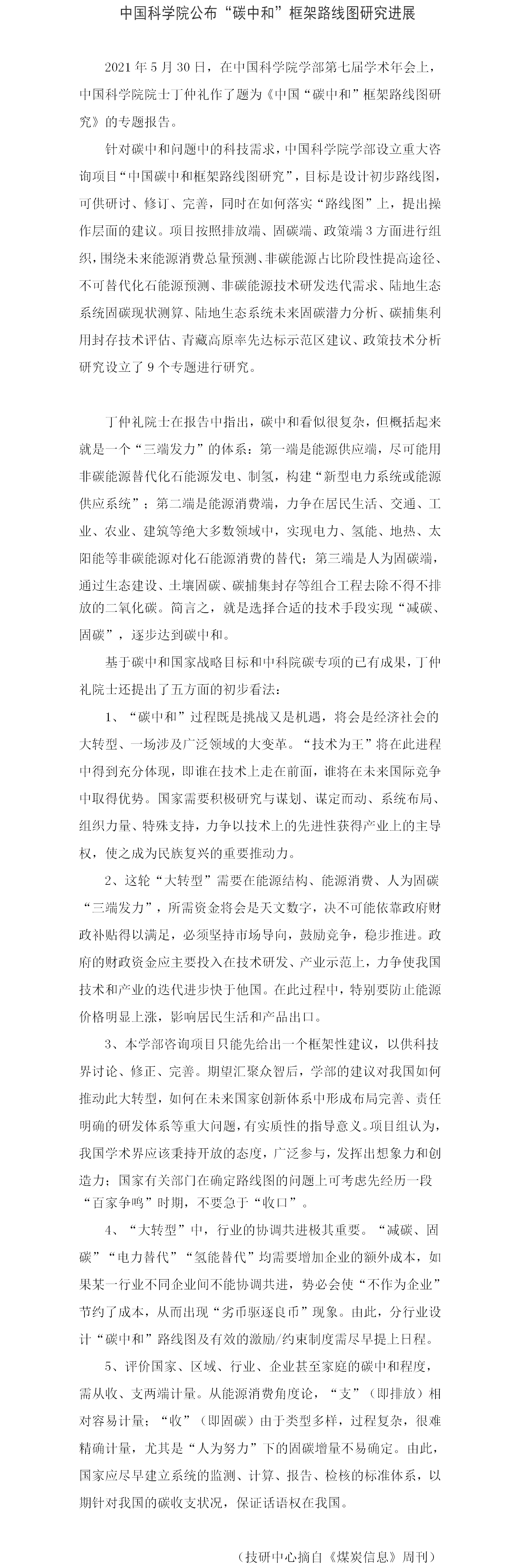 中國科學(xué)院公布“碳中和”框架路線圖研究進展