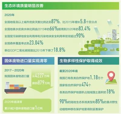 2020年,全國地級及以上城市優(yōu)良天數(shù)比例達(dá)到87%,比2015年增長5.8個百分點(diǎn);PM2.5未達(dá)標(biāo)地級及以上城市平均濃度達(dá)到37微克/立方米,比2015年下降28.8%;全國地表水優(yōu)良水體比例由2015年的66%提高到2020年的83.4%,劣Ⅴ類水體比例由2015年的9.7%下降到了2020年的0.6%;全國受污染耕地安全利用率和污染地塊安全利用率雙雙超過90%;全國森林覆蓋率達(dá)到23.04%,自然保護(hù)區(qū)以及各類自然保護(hù)地面積占到陸域國土面積的18%;單位GDP二氧化碳排放比2015年下降了18.8%。