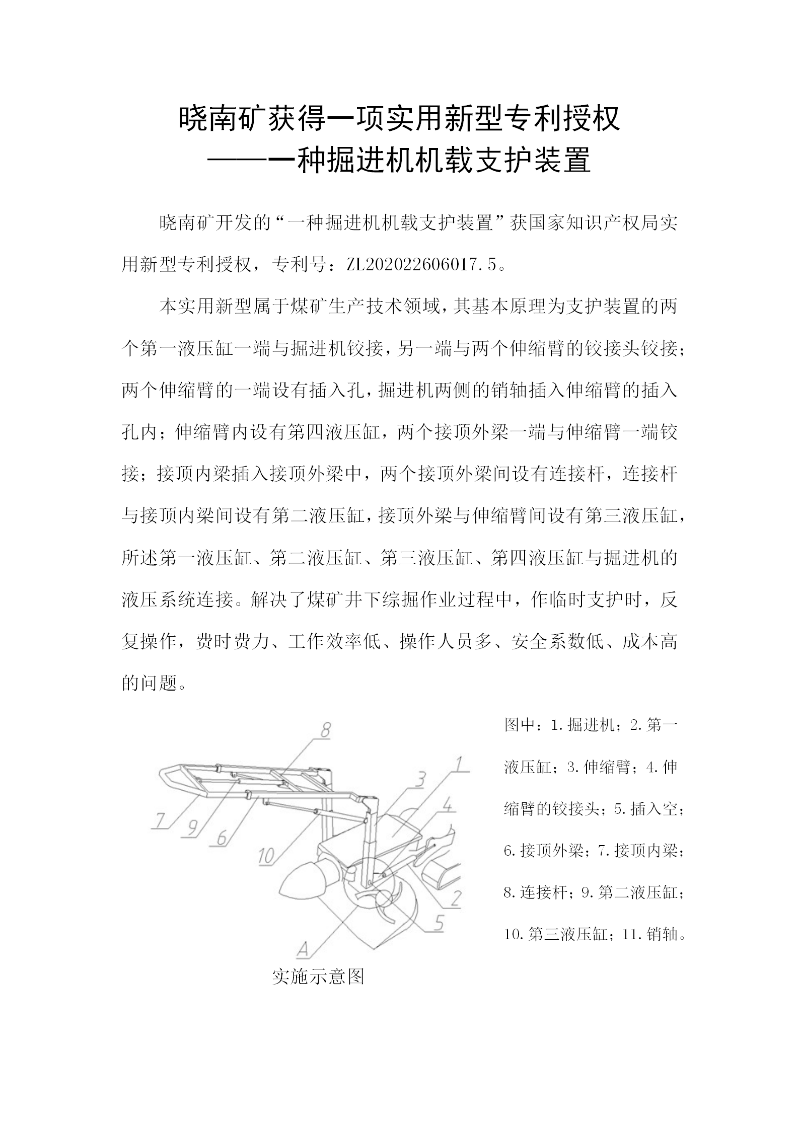 曉南礦獲得一項實用新型專利授權——一種掘進機機載支護裝置_01