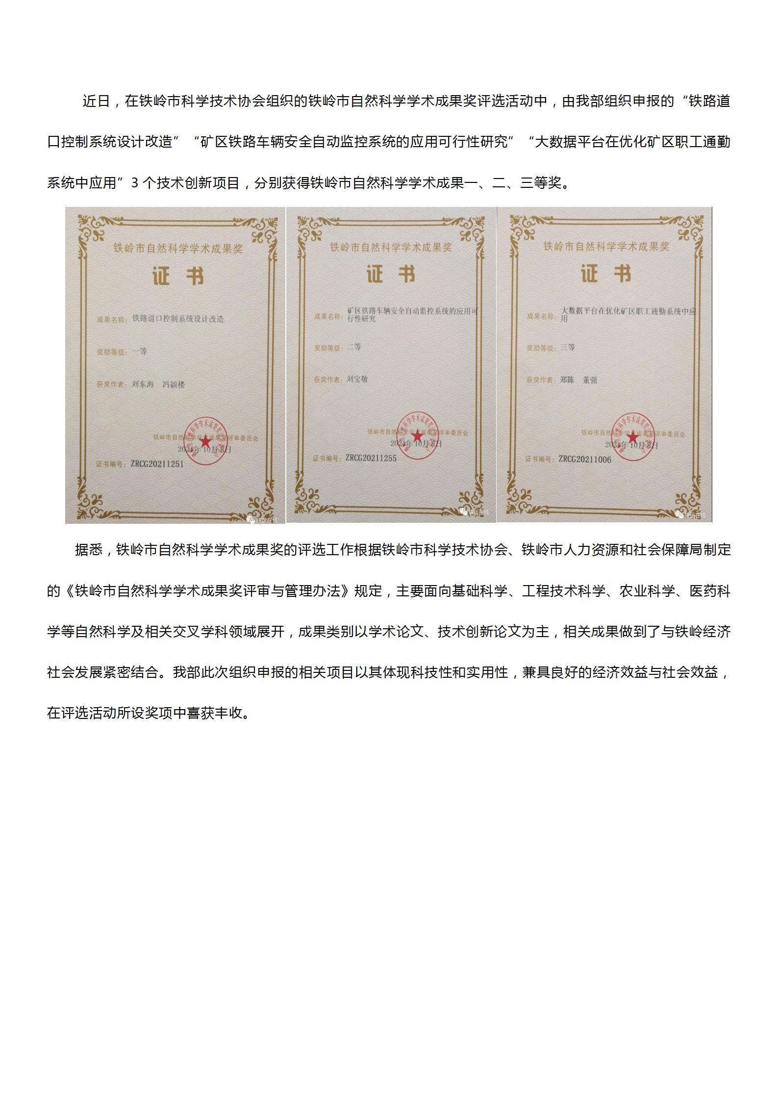 運輸部三個科技項目獲得鐵嶺市自然科學(xué)學(xué)術(shù)成果獎