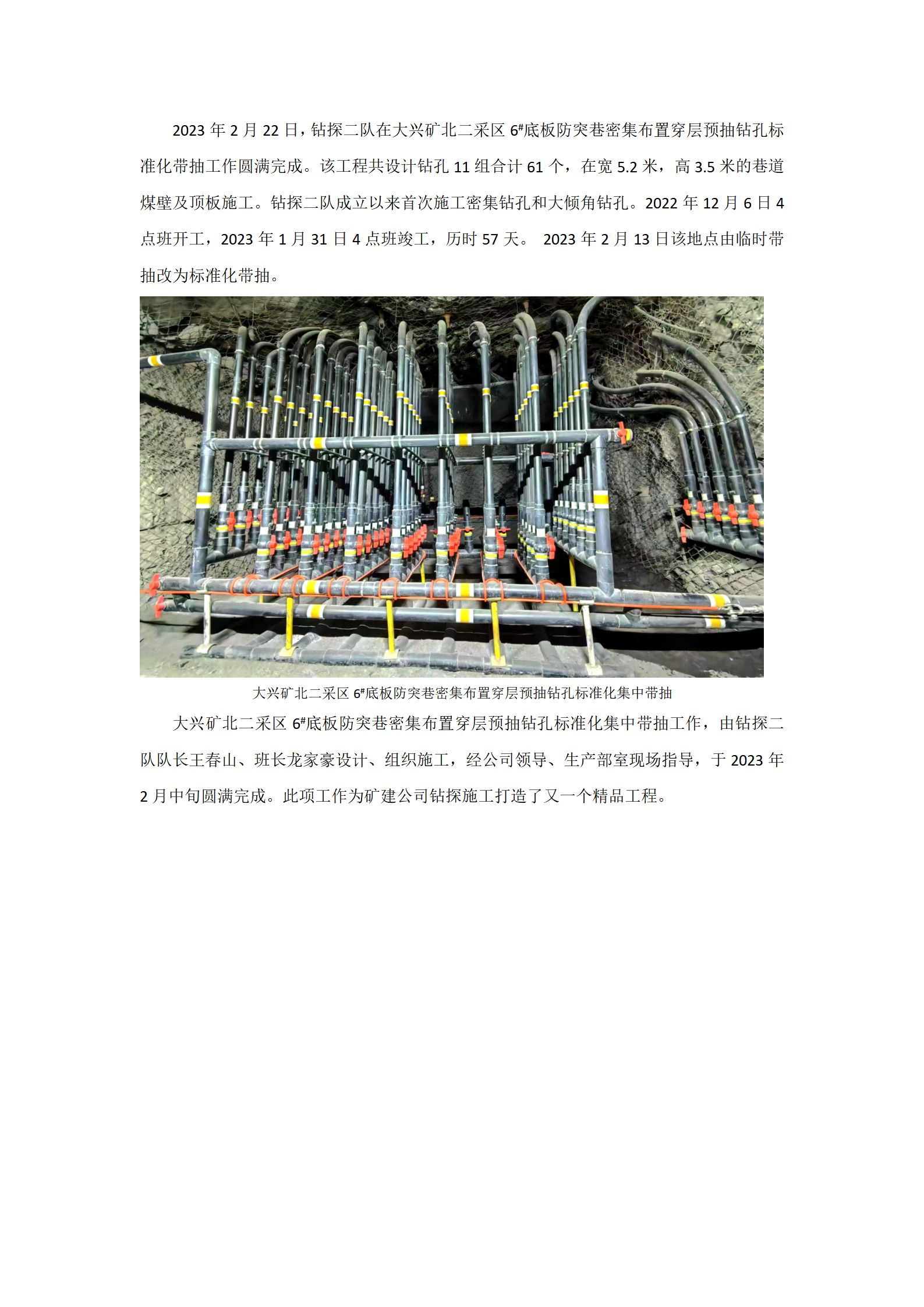 礦建公司鉆探二隊密集布置穿層預(yù)抽鉆孔標(biāo)準(zhǔn)化集中帶抽工作圓滿完成