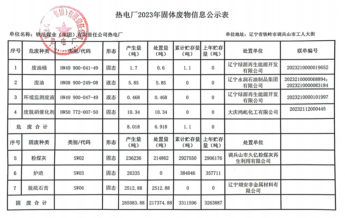 熱電廠2023年度固體廢物污染環(huán)境防治信息