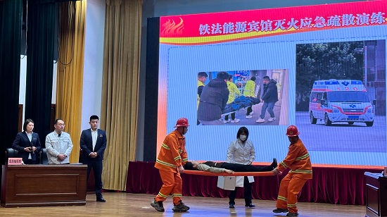 與會人員共同觀看了消防安全視頻宣傳片和公司賓館以情景劇模式開展的突發(fā)火災(zāi)事故應(yīng)急疏散演練。