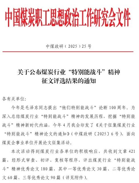 據(jù)了解,本次評選活動共收到論文421篇,最后評出煤炭行業(yè)“特別能戰(zhàn)斗”精神優(yōu)秀論文180篇。