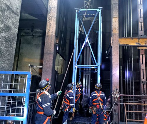 最棘手的硬仗當(dāng)屬大平礦主井罐道更換。這座井筒深達(dá)687米、直徑5.5米,內(nèi)部的鋼罐道是箕斗升降的“軌道”,常年摩擦下,部分區(qū)段磨損嚴(yán)重,若不及時(shí)更換,極可能引發(fā)箕斗卡頓,甚至誘發(fā)安全事故。劉明和部室人員與機(jī)電一隊(duì)創(chuàng)新采用“雙層吊架作業(yè)方案”,解決了施工中的許多難題,極大地提高了施工的安全性和施工效率。